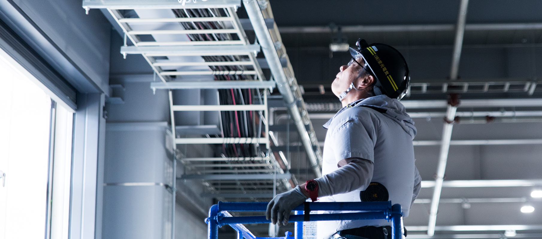 電気設備・通信配線工事、オフィス・工場の空調工事、高圧電気設備工事の3つの事業で、企業様の安心と快適な環境づくりを支えます。